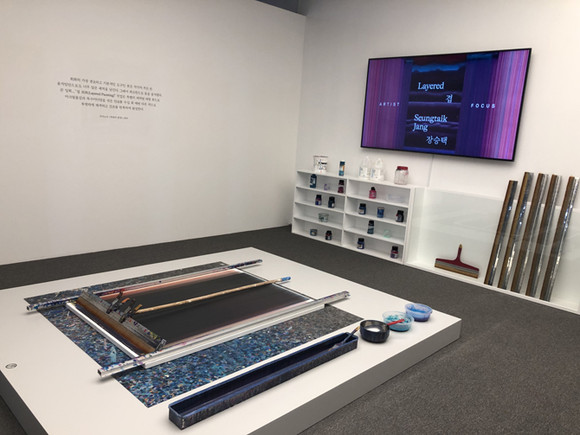 전시장 한켠엔 작가의 초기 겹회화 작품을 비롯해 직접 제작한 도구를 함께 선보이며 작가의 작업실을 구현해 놓아 눈길을 끈다. 이 공간에서는 한 겹 한 겹 색이 쌓이는 겹회화의 과정을 보다 생생하게 느껴볼 수 있는 체험 공간도 구성됐다.