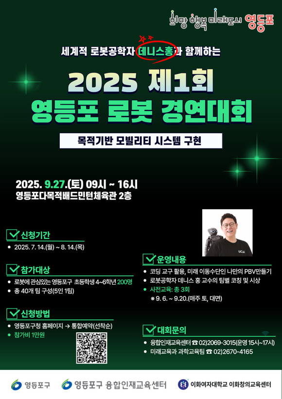 또 9월 27일에는 세계적 로봇공학자 ‘데니스 홍’과 함께하는 ‘제1회 영등포 로로봇경연대회’가 개최된다. 관내 초등학교 4~6학년 200명이 사회문제 해결을 주제로 직접 로봇을 제작하고, 데니스 홍 교수가 현장에서 코칭을 진행한다. 구는 이번 대회를 영등포 대표 과학경연으로 발전시켜 차세대 혁신 인재를 발굴해나갈 계획이다.
