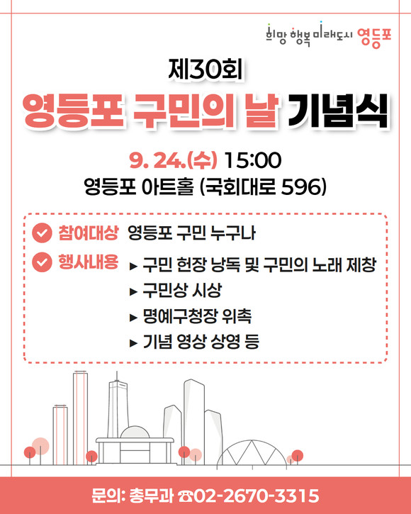 서울 영등포구(구청장 최호권)가 ‘제30회 영등포 구민의 날’을 맞아 9월 15일부터 29일까지 구민이 함께 즐길 수 있는 다양한 기념행사와 특별 혜택을 마련했다고 밝혔다.