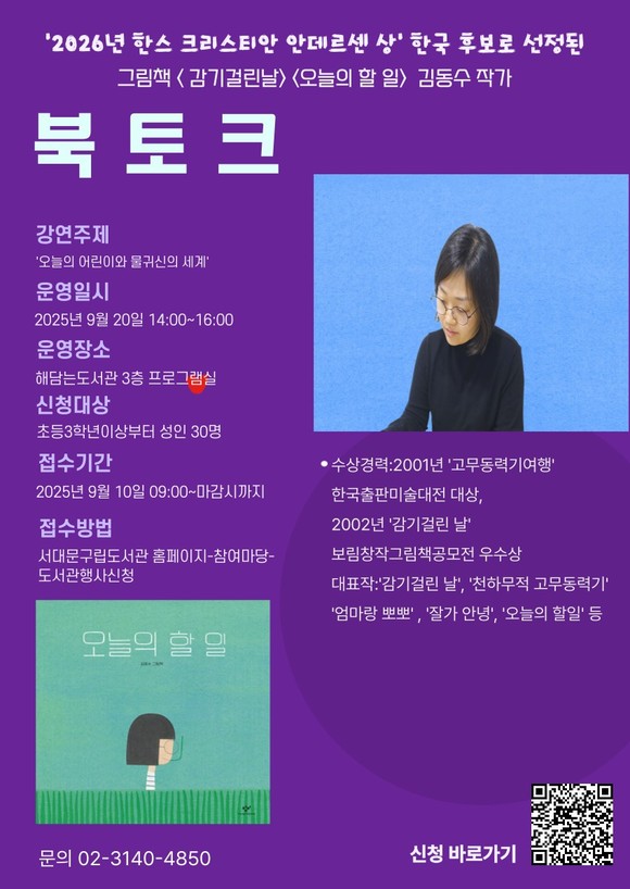 서울 서대문구(구청장 이성헌)가 구립 해담는도서관 개관을 기념해 이달 20일 오후 2∼4시 도서관 3층 프로그램실에서 김동수 그림책 작가 초청 북토크 프로그램을 연다.