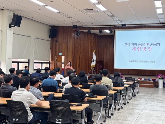 교육은 강민정 도봉구 정신건강복지센터 부센터장이 맡아 ▲정신질환과 경찰관 직무집행법에 따른 자·타해에 대한 기준 통일 ▲정신건강 및 자살고위험군의 치료적 지원을 위한 현실적 방안과 대응 체계 등을 강의했다.