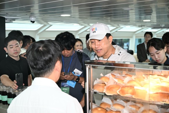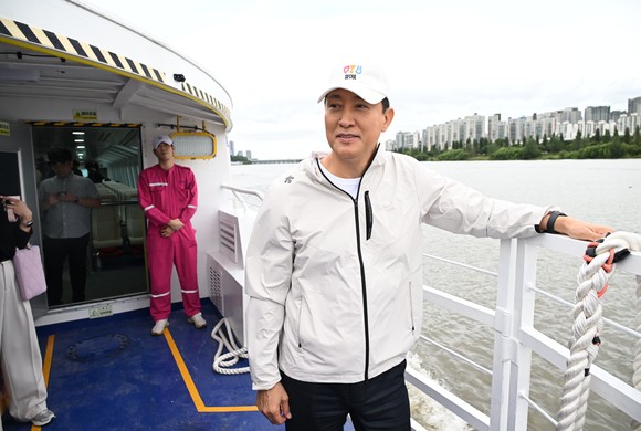 한 손에는 베이글, 다른 한 손에는 커피를 들고 승선한 오 시장은 한강버스 안에서 새로운 서울 라이프스타일을 느끼며 여의도에서 뚝섬까지 이동했다.