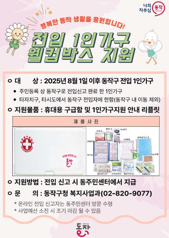 서울 동작구(구청장 박일하)가 지난 8월부터 전격 시행한 ‘전입 1인 가구 웰컴박스 지원사업’이 한 달 만에 700여 가구가 참여하며 순조로운 출발을 알렸다.