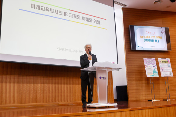 이번 특강은 ‘미래교육으로서 IB 교육의 이해와 의의’를 주제로 현 인하대학교 IB연구센터 초빙교수인 임영구 교수가 강연을 진행했다. 임영구 교수는 서울대 인문대학 미학과를 졸업하고 전 제주 표선고등학교 교장을 역임한 IB 교육 전문가로, 전국 최초 학교 단위 IB월드스쿨로 인증된 제주 표선고를 성공적으로 운영한 경험을 바탕으로 생생한 현장 사례를 제시했다.