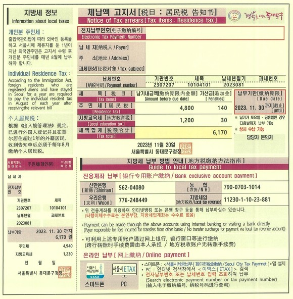 이에 동대문구는 한국어와 함께 영어·중국어를 병기한 체납 안내문을 제작했다. 안내문 앞면은 기존 체납고지서 형식을 유지하면서 주요 은행(신한·우리·농협) 전용계좌를 명시해 납부 편의를 높였다. 뒷면에는 체납 시 불이익 내용을 한국어·영어·중국어·베트남어 4개 언어로 안내해 외국인도 쉽게 이해할 수 있도록 했다.