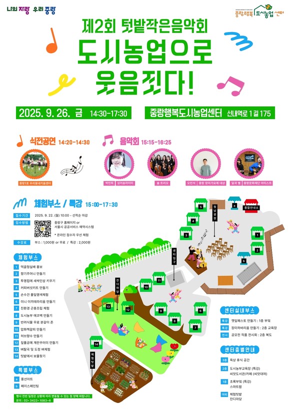 오는 9월 26일 금요일에 열리는 ‘제2회 텃밭작은음악회’도 센터 누리집을 통해 자세한 내용을 확인할 수 있다. 이번 행사는 도시농업의 가치를 널리 알리고, 구민들이 함께 소통하고 즐기는 시간을 제공하기 위해 마련됐다.