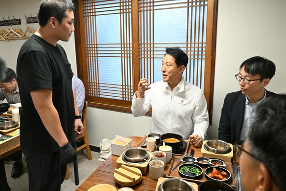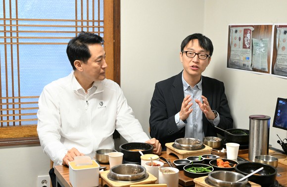 오세훈 서울시장이 19일 오후 12시, 중구 소재 한 식당에서 정희원 서울건강총괄관과 외식이나 배달시에도 흰쌀밥 대신 통곡물‧잡곡밥을 선택할 수 있는 ‘통쾌한 한끼’ 추진 전략을 논의했다.