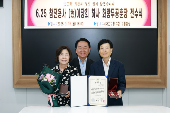 전수식에서 이성헌 서대문구청장은 유가족에게 화랑무공훈장증과 훈장, 기념패를 전하며 “조국을 위해 헌신한 영웅의 업적을 기릴 수 있어 뜻깊다”고 말했다.