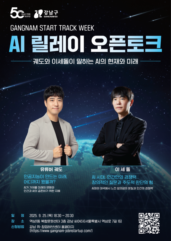 구민을 위한 AI 릴레이 강연도 마련됐다. 25일 오후 6시 30분 역삼1동 복합문화센터 강남씨어터에서 유튜브 채널 ‘안될과학’의 궤도가 ‘AI가 가져올 미래와 인간의 지혜’를, 프로 바둑기사 출신 이세돌이 ‘AI 시대, 인간만의 경쟁력’을 주제로 강연한다.