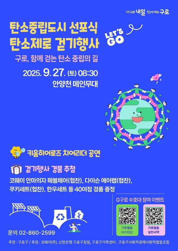 서울 구로구(구청장 장인홍)가 오는 27일 오전 8시 30분 안양천 구로G페스티벌 메인무대에서 ‘구로, 함께 걷는 탄소중립의 길’을 주제로 ‘탄소중립도시 구로’ 선포식을 개최한다.
