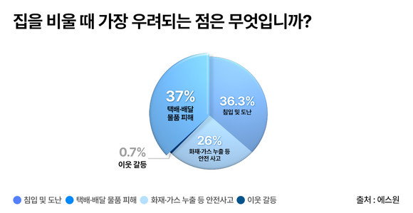 ‘연휴 기간 집을 비울 때 불안감을 느끼는가’의 질문엔 응답자의 67%가 ‘그렇다’고 답했다. 10명 중 7명이 빈집 안전에 대한 우려를 나타낸 셈이다. ‘집을 비울 때 가장 우려되는 점’으로는 △택배·배달 물품 피해(37%) △침입 및 도난(36%) △화재·가스 누출 등 안전사고(26%) 순으로 조사됐다.