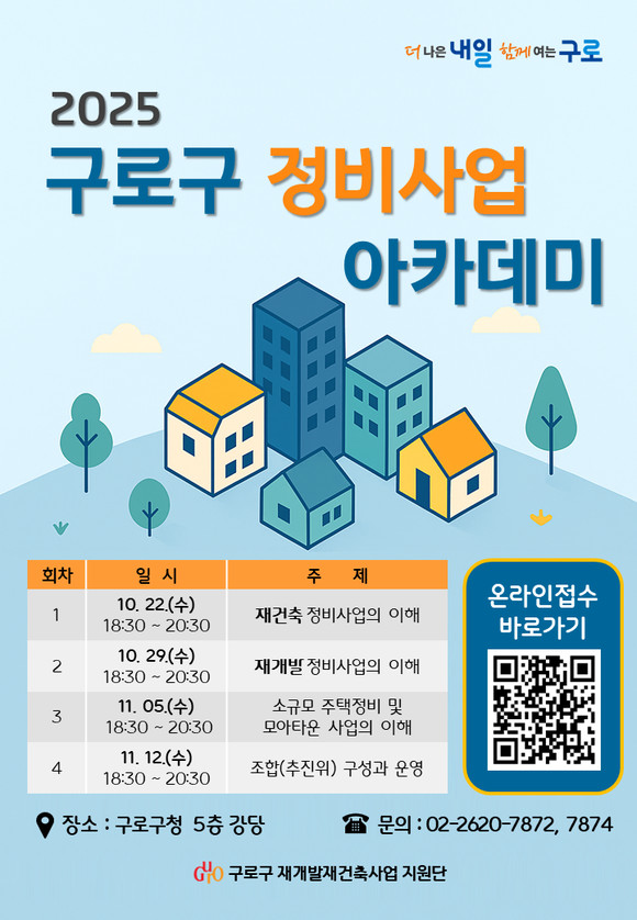 서울 구로구(구청장 장인홍)가 10월 22일부터 11월 12일까지 매주 수요일 오후 6시 30분 구청 강당에서 ‘2025 구로구 정비사업 아카데미’를 처음으로 운영한다.