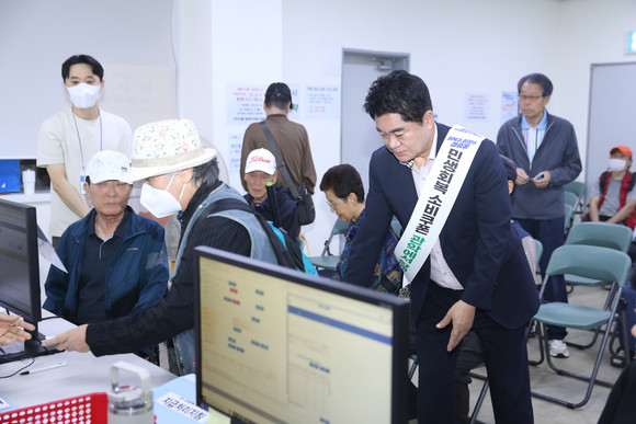 2차 민생회복 소비쿠폰 접수를 시작한 은천동 주민센터에서 민원인을 안내하는 박준희 관악구청장. 사진=관악구청