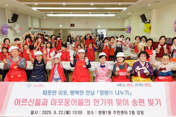 서울 마포구(구청장 박강수)는 9월 22일 오후, 망원1동 주민센터 강당에서 어르신들과 아동, 지역 봉사단체가 함께하는 ‘한가위 맞이 송편 나눔 행사’를 열었다.