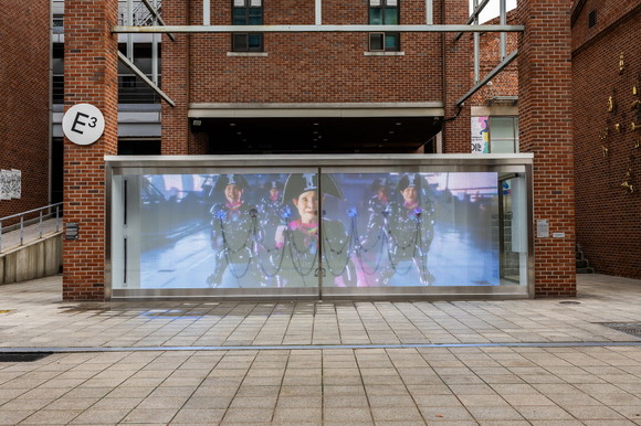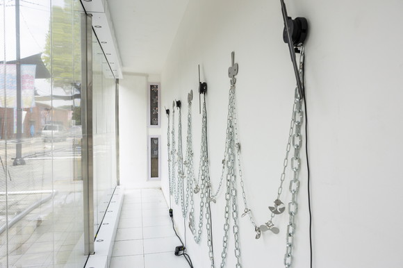 미디어월을 활용한 첫 번째 전시를 선보이는 얄루(Yaloo) 작가는 투명 디스플레이의 장점을 적극적으로 살려 작업했다. <신인호 프롬 미추홀 Shininho From Meetchu Hole>이라는 작품은 금속 절단 조형물, 홀로그램 팬 등 설치 요소에 3D 애니메이션 영상이 결합한 형태다.