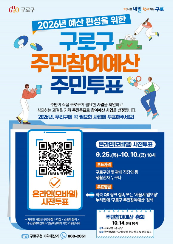 서울 구로구(구청장 장인홍)가 오는 25일 오전 9시부터 10월 10일 오후 6시까지 ‘2026년 주민참여예산 사업’ 선정을 위한 온라인 투표(엠보팅)를 실시한다.