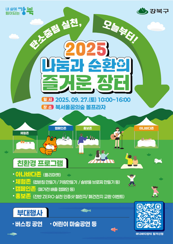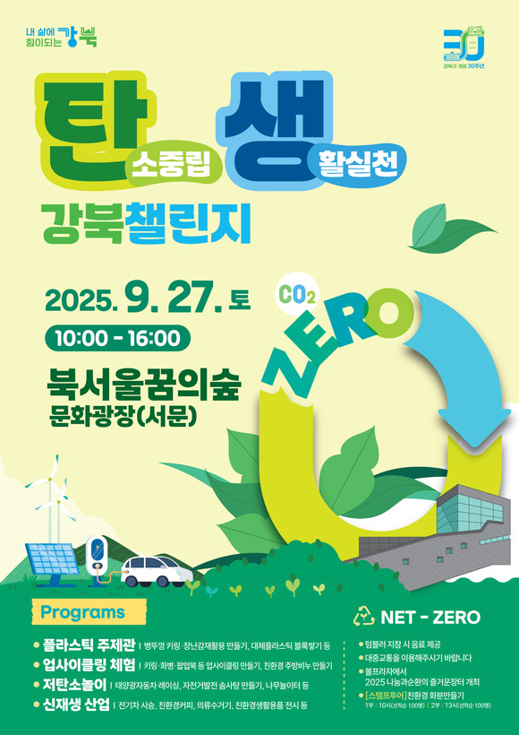 서울 강북구(구청장 이순희)는 오는 9월 27일(토) 오전 10시부터 오후 4시까지 북서울꿈의숲 일대에서 ‘탄생 강북 챌린지(탄소중립 생활실천 강북 챌린지)’와 ‘2025 나눔과 순환의 즐거운 장터’를 개최한다.