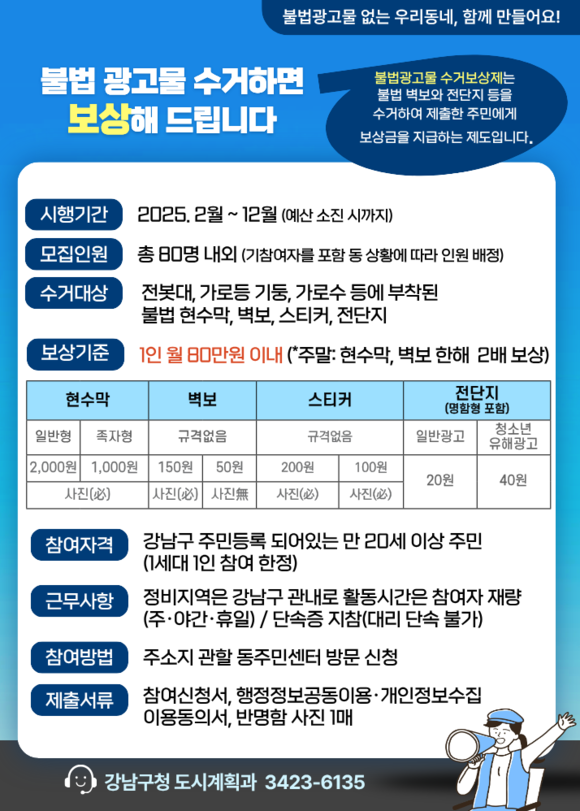 서울 강남구(구청장 조성명)가 불법 유동광고물 근절을 위해 운영 중인 ‘수거보상제’의 참여 인원을 대폭 확대한다. 구는 주민 약 60명을 새롭게 모집해 더 많은 주민이 직접 거리 정비에 나설 수 있도록 했다.