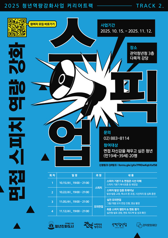 이번 '스픽업' 프로그램은 10월 15일부터 11월 12일까지 매주 화요일 오후 7시부터 9시까지 관악청년청에서 진행된다. 프로그램 참가는 무료이며, 자세한 사항은 관악청년청 홈페이지나 전화 문의를 통해 확인할 수 있다.