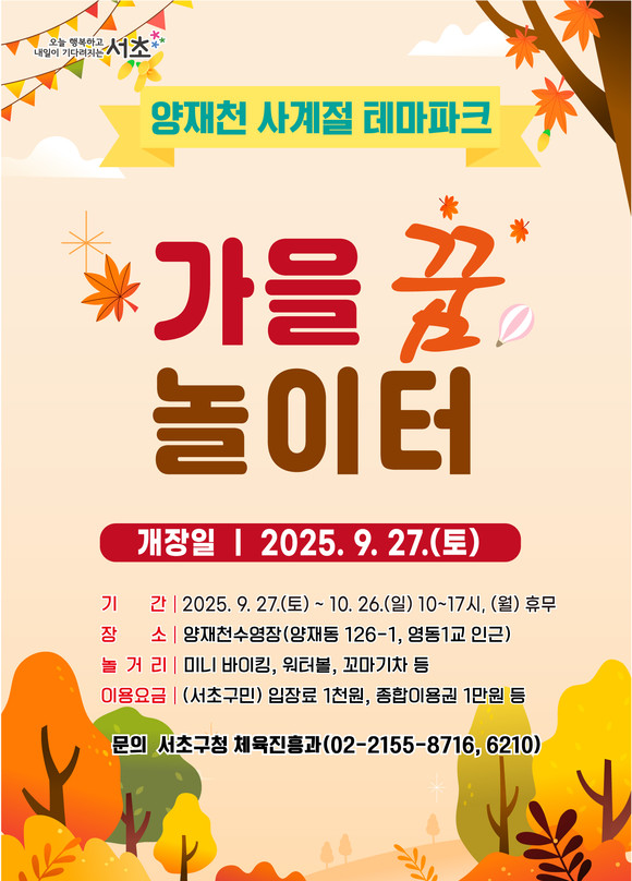 서울 서초구(구청장 전성수)는 지난 여름 큰 사랑을 받았던 양재천 수영장을 가을을 맞아 오는 27일부터 어린이 테마파크인 ‘가을꿈놀이터’로 운영한다고 밝혔다.