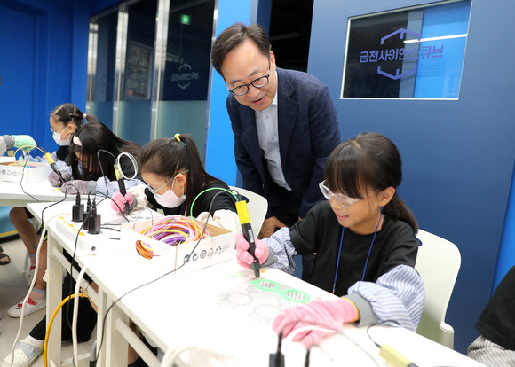 유성훈 금천구청장이 금천사이언스큐브 교육에 참여하고 있는 학생들을 응원하고 있다. 사진=금천구청