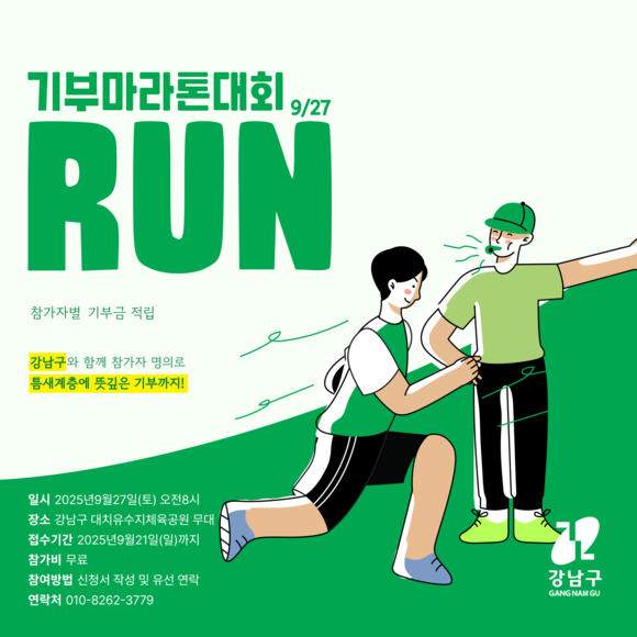 서울 강남구(구청장 조성명)가 오는 9월 27일 오전 9시부터 오후 2시 30분까지 양재천 일대에서 ‘기부-Run 강남 달리기’ 행사를 개최한다. 이 행사는 참가자의 걸음과 달리기가 기부로 이어지는 기부 연계형 건강 캠페인으로, 건강한 나눔을 실천하는 지역사회 공헌 프로그램이다.