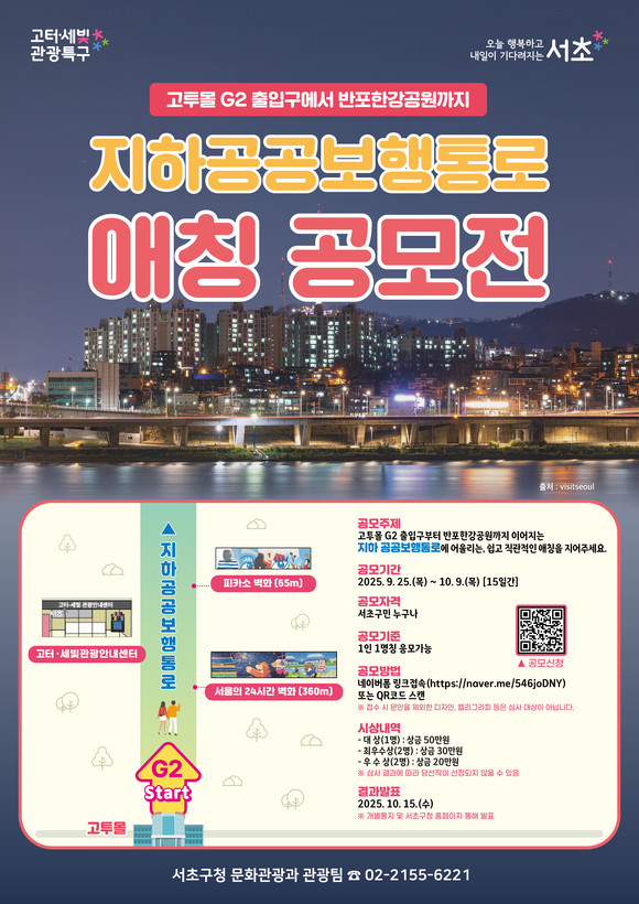 전성수 서초구청장은 “주민들의 창의적이고 톡톡 튀는 아이디어가 모여 지하 공공보행통로가 새 이름으로 거듭나길 바란다”며 “이번 공모전을 통해 해당 공간이 더욱 많은 이들에게 사랑받고, 지역 문화예술의 중심지로 자리매김하길 기대한다”고 밝혔다.