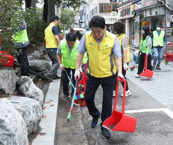 중앙동 직원들과 함께 추석맞이 대청소하는 박준희 관악구청장. 사진=관악구청