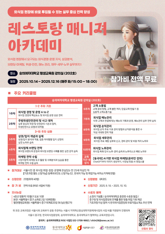 10월 14일부터 12월 18일까지 숭의여자대학교에서 진행되는 <2025 외식업 특화 직무양성과정>은 숭의여대·동국대 RISE사업단과 함께 설계한 맞춤형 교육과정으로, 지자체·대학·산업체가 협력하는 사업이다.