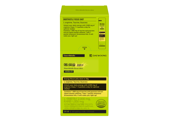 에너씨슬 집중샷은 스틱형 젤리 타입으로, 밀크씨슬과 비타민B군 3종, 식물성 천연 카페인 성분인 과라나 추출물을 함유한 일반 식품이다.