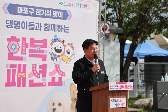 한가위맞이 댕댕이 한복패션쇼 개최를 축하하는 박강수 마포구청장. 사진=마포구청