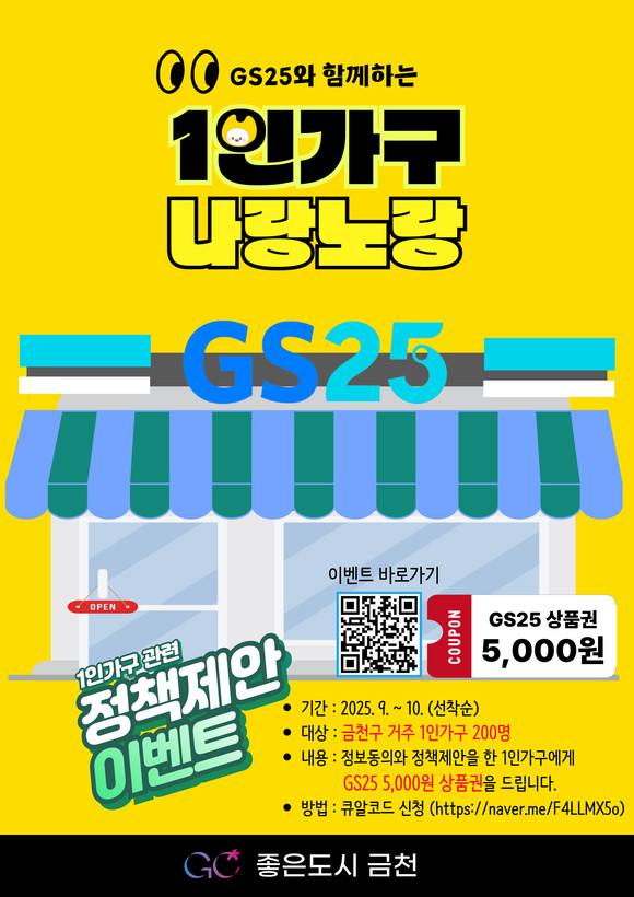 아울러, 홍보존에 삽입된 QR코드를 통해 정보제공에 동의하고 1인가구 정책제안을 한 1인가구 200명에게는 GS25 상품권(5000원권)을 제공하는 이벤트도 진행하고 있다.