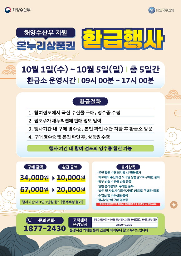 행사 기간 중 참여 점포에서 국산 신선 농축산물 또는 수산물을 구매한 소비자는 구매 금액의 최대 30%를 온누리상품권으로 환급받을 수 있다. 품목별(농축산물, 수산물)로 1인당 각각 2만 원까지 환급이 가능해, 두 부문을 모두 이용하면 최대 4만 원의 혜택을 받을 수 있다. 환급 금액은 ▲3만 4천 원 이상~6만 7천 원 미만 구매 시 1만 원, ▲6만 7천 원 이상 구매 시 2만 원이다.