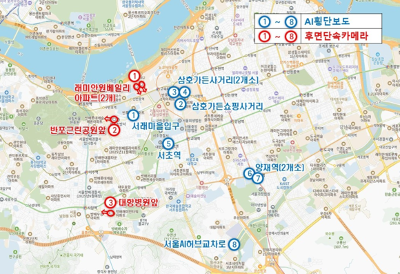 서울 서초구(구청장 전성수)가 올해 ‘서초형 AI 횡단보도’를 서래마을 입구와 삼호가든쇼핑사거리 등 6곳에 8개 추가 설치하여 보행자 안전을 강화했다고 밝혔다.