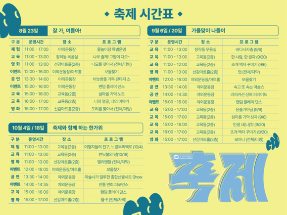 공연과 함께 즐길 수 있는 문화예술 교육 프로그램도 다채롭게 마련돼 있다. 10월 4일에는 시화호 환경지킴이 활동을 기반으로 구성된 단체 ‘지지네이처’의 《여행자들의 친구, 노랑부리백로》는 시화방조제가 건설되면서 생긴 큰 호수인 시화호를 찾아오는 노랑부리백로를 비롯한 수많은 철새들에 대해 알아보고, 직접 관찰하면서 손수건에 새 모양을 따라 컬러링을 하는 프로그램이다. 10월 18일에는 나를 지켜주는 수호신을 그려서 소원등을 만드는 프로그램과, 경기창작캠퍼스가 위치한 선감도 지역의 사람들에 관한 이야기를 나누고 그 사람의 이야기를 글자에 담아보는 《한 사람, 한 글자》 프로그램이 준비돼 있다. 모든 프로그램은 경기창작캠퍼스 누리집에서 사전 예약을 통해 참여할 수 있다.