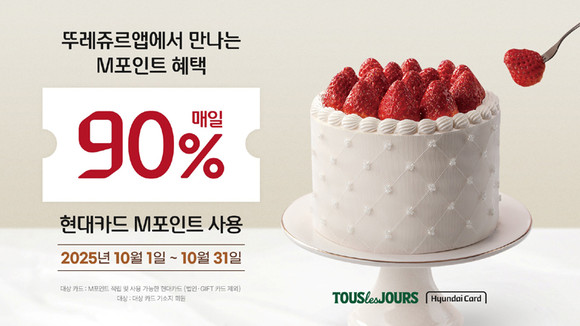 이번 프로모션은 뚜레쥬르 공식 앱에서 현대카드로 결제 시 구매 금액의 최대 90%까지 M포인트를 사용할 수 있는 이벤트다. M포인트 적립 및 사용 가능한 현대카드 기소지 회원이라면 누구나 참여 가능하며, 결제 금액의 제한 없이 카드 이용객이 보유한 잔여 M포인트 안에서 자유롭게 사용 가능하다. 단, 간편결제 서비스, 쿠폰 및 타 제휴 카드 혜택과는 중복 적용되지 않는다.
