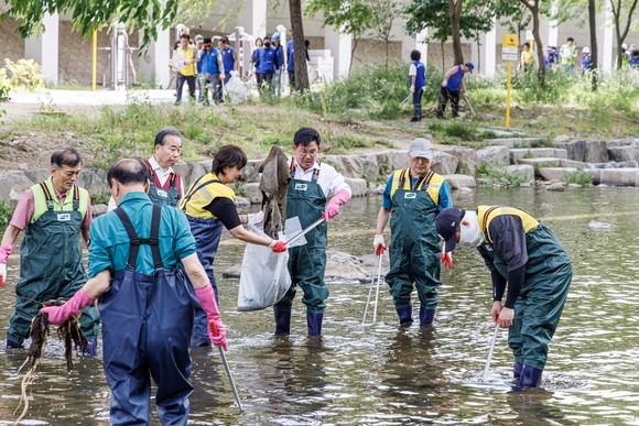 박강수 마포구청장이 하천 정화 활동을 펼치고 있다. 사진=마포구청