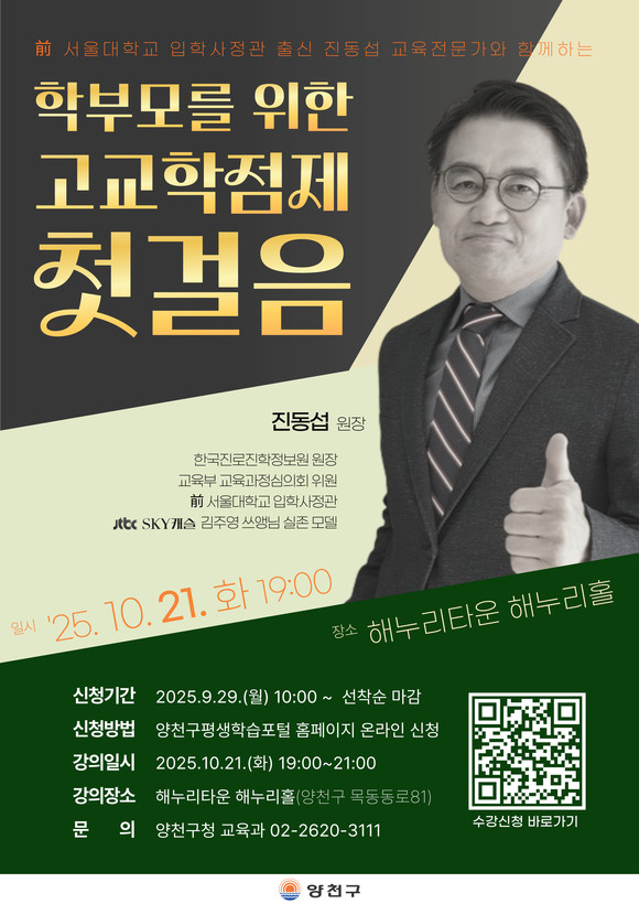 이기재 양천구청장은 이번 설명회가 맞춤형 진로·진학 정보를 제공해 고교 입학을 앞둔 학생과 학부모의 걱정을 덜고, 성공적인 입시 전략을 세우는 데 든든한 길잡이가 되길 바란다고 전했다.