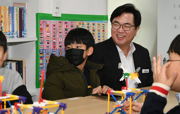박일하 동작구청장이 지난해 12월 서울 동작구 사당3동 우리동네키움센터에서 ‘AI 로봇 발명 메이커 대회’ 수상 아동들과 대화를 나누고 있다. 사진=동작구청