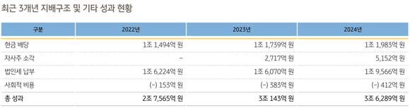 지배구조 및 기타 성과는 총 3조 6289억 원으로 집계됐는데, 이는 현금 배당 및 자사주 소각을 통한 주주환원(1조 7135억 원)과 약 1조 9566억 원의 법인세 납부를 통한 국가 재정 기여가 포함된다.