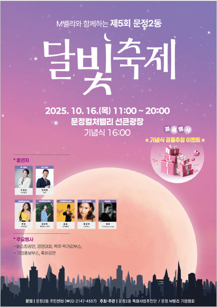 서울 송파구(구청장 서강석) 문정2동 특화사업단과 문정M밸리기업협회는 오는 10월 16일(목) 문정선큰광장에서 문정M밸리와 함께하는 제5회 문정2동 달빛축제를 개최한다.