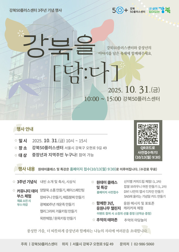 이날 행사는 강북50플러스센터 사업 우수 참여자 시상식이 진행되는 3주년 기념식을 비롯해 커뮤니티 데이 부스 체험, 원데이 클래스 및 특강, 추억의 테마존 등 다양한 프로그램으로 구성된다.