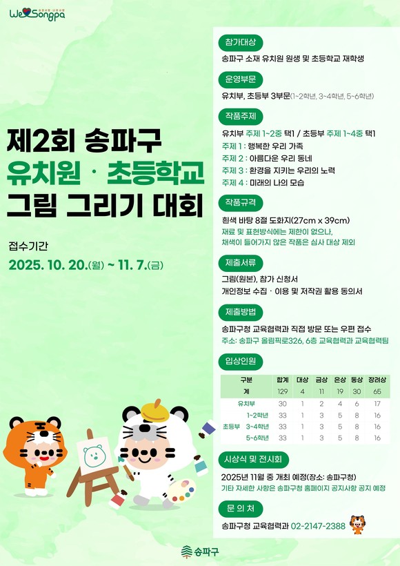서강석 송파구청장은 “이번 그림 대회가 어린이들이 예술적 감수성을 자유롭게 표현하고, 상상력을 마음껏 발휘할 수 있는 소중한 기회가 되길 바란다”며, “앞으로도 미래의 주역인 아이들이 다양한 문화 활동을 체험하며 성장할 수 있도록 송파구만의 교육 정책을 펼쳐 나가겠다.”고 전했다.