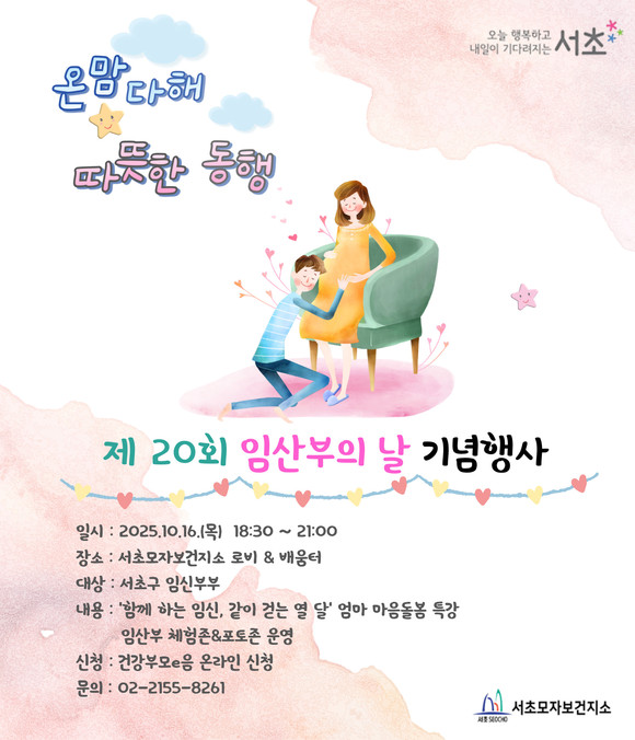 서울 서초구(구청장 전성수)는 제20회 임산부의 날(10.10.)을 맞아 16일 오후 6시 30분부터 9시까지 서초보건지소에서 ‘온맘다해, 따뜻한 동행’을 주제로 기념행사를 개최한다고 밝혔다.