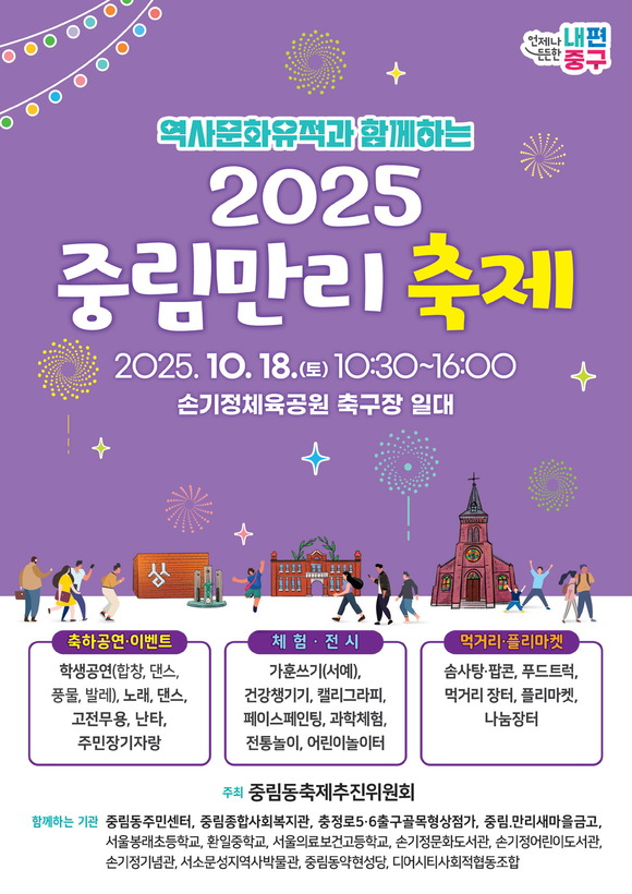 서울 중구는 중림동 손기정체육공원 축구장 일대에서 오는 18일(토) 오전10시부터 오후6시까지 ‘2025 중림만리 축제’가 열린다고 밝혔다.