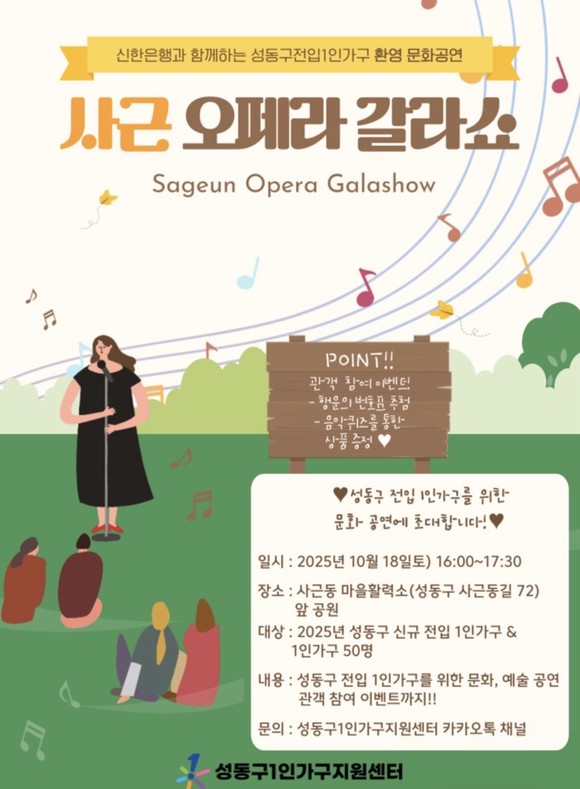 서울 성동구(구청장 정원오)는 오는 10월 18일 토요일 오후 4시부터 5시 30분까지 사근마을활력소(성동구 사근동길 72) 앞 공원에서 1인가구를 위한 특별한 음악회 ‘사근 오페라 갈라쇼’를 개최한다고 밝혔다.