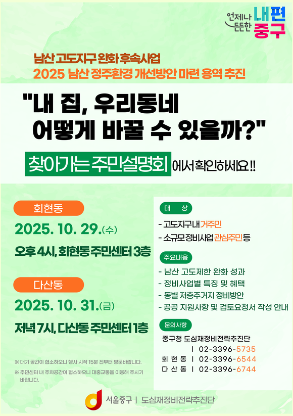 서울 중구가 오는 10월 29일(수)과 31일(금) 회현동과 다산동 주민센터에서 <찾아가는 주민설명회>를 열고 남산 고도지구 완화 후속사업과 남산 정주환경 개선방안을 주민들과 공유한다.