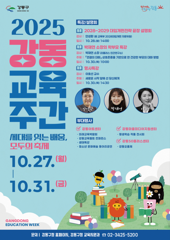 서울 강동구(구청장 이수희)는 오는 10월 27일(월)~10월 31일(금) 「2025 강동교육주간」을 연다고 밝혔다. ‘세대를 잇는 배움, 모두의 축제’라는 주제로 지역 주민 누구나 참여할 수 있는 강연과 전시, 체험 프로그램이 5일간 이어질 예정이다.