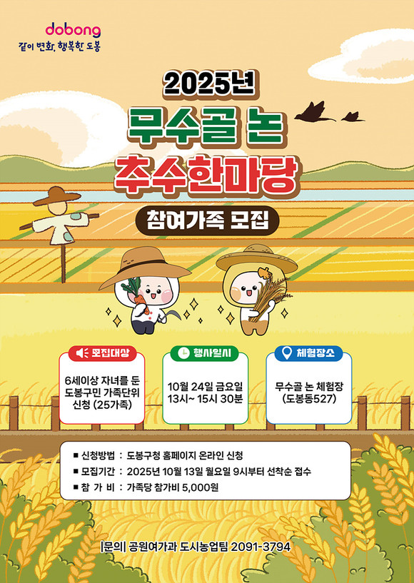 서울 도봉구(구청장 오언석)가 오는 10월 24일 무수골 친환경 논 체험장(도봉동 527)에서 ‘무수골 논 추수한마당’ 행사를 개최한다.