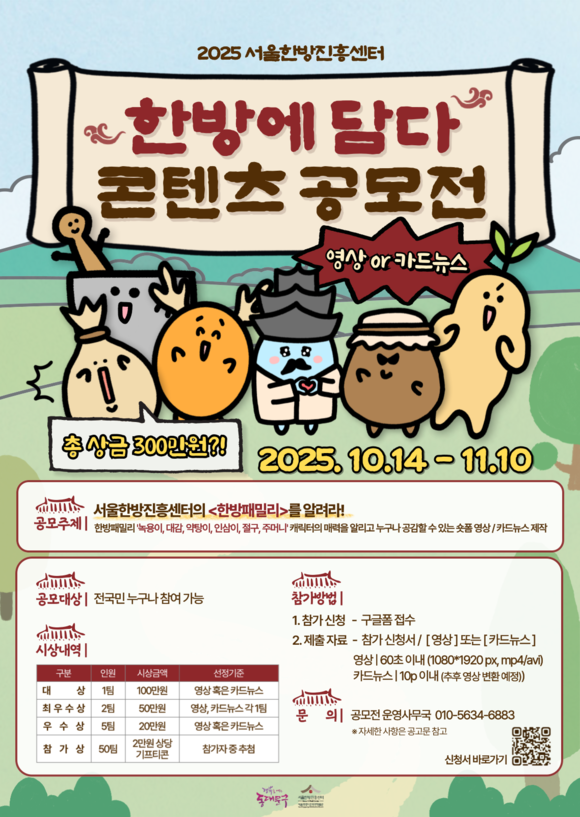 서울 동대문구(구청장 이필형)는 한방산업특구 서울약령시에 위치한 서울한방진흥센터(서울약령시한의약박물관)가 ‘2025 한방에 담다 콘텐츠 공모전’을 개최한다고 밝혔다.